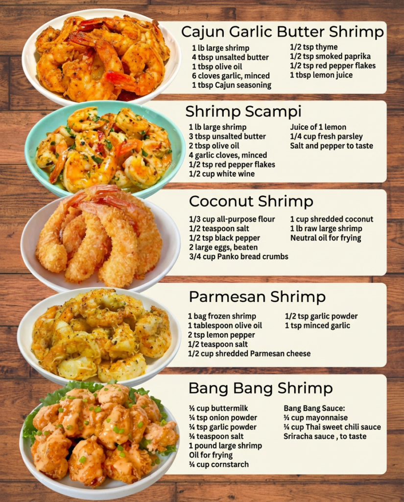 5 Irresistible Shrimp Recipes: Cajun Garlic Butter, Scampi, Coconut, Parmesan & Bang BangCraving restaurant-quality shrimp dishes at home? These 5 easy, flavorful recipes