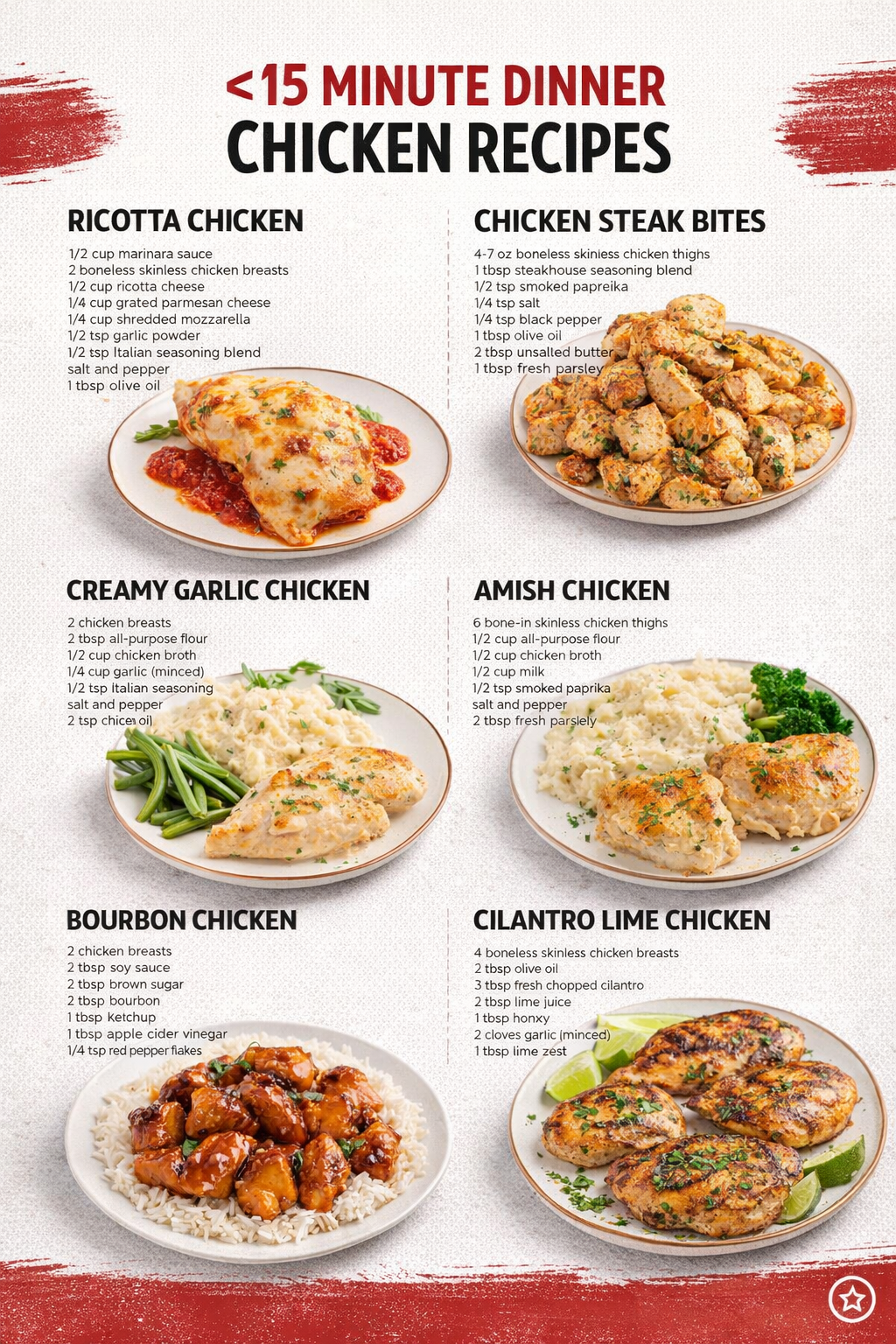 When you’re short on time but craving a home-cooked meal, these quick chicken recipes deliver big flavor in under 15 minutes of active prep. From cheesy ricotta-topped chicken to garlicky steak bites and sweet bourbon-glazed pieces, each uses boneless chicken (breasts or thighs) and pantry staples. They’re family-friendly, customizable, and perfect for weeknight dinners, meal prep, or casual entertaining.