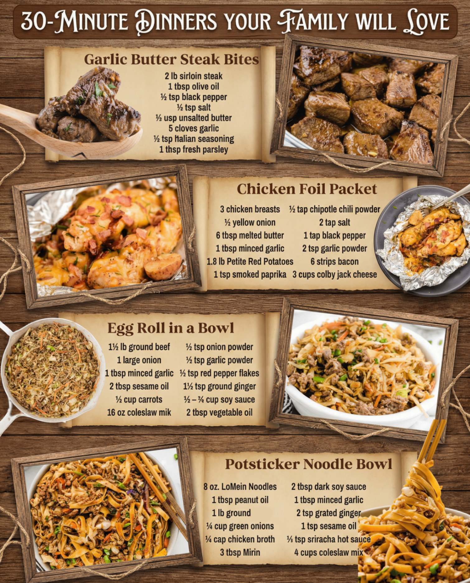 When life gets hectic, you need dinners that come together fast without sacrificing flavor. These four crowd-pleasing recipes each take 30 minutes or less from start to finish — and cleanup is a breeze! From juicy garlic butter steak bites to cheesy foil-pack chicken, deconstructed egg rolls, and saucy potsticker noodles, these meals deliver big taste with simple ingredients.