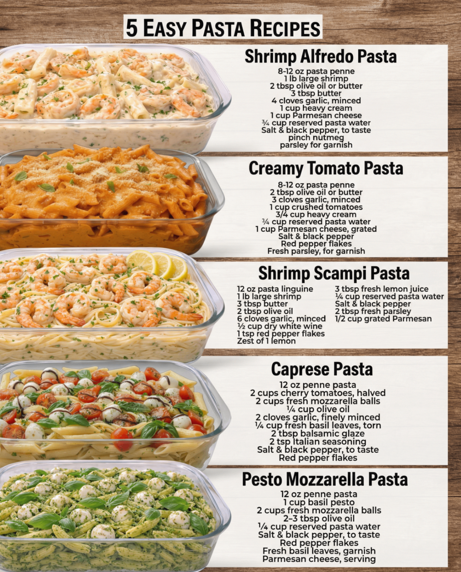 These 5 easy pasta recipes prove you don’t need fancy skills or hours to create delicious, satisfying meals. From the indulgent Shrimp Alfredo to the fresh Caprese and vibrant Pesto Mozzarella, there’s something for every craving and occasion. They’re budget-friendly, use everyday ingredients, and deliver restaurant-level taste at home. Try one tonight—your family will thank you! Which will you make first? Share in the comments below, and happy cooking!