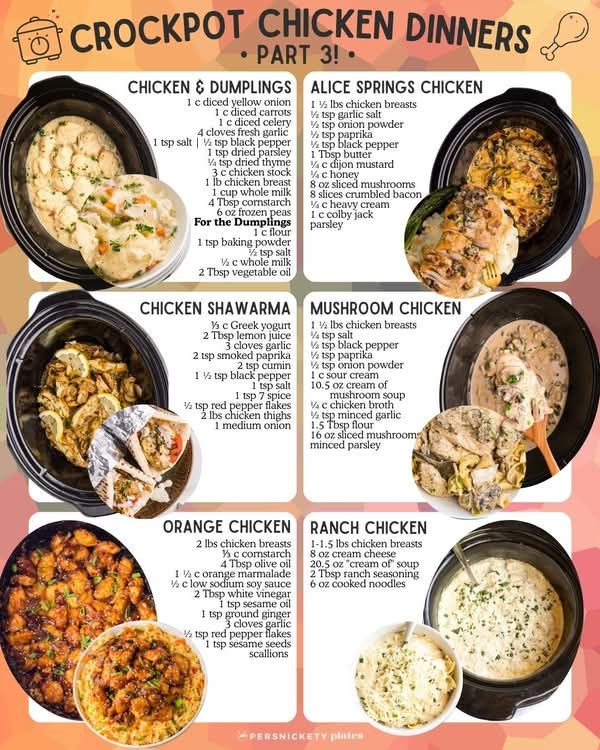 From classic Chicken & Dumplings to creamy Alice Springs Chicken, bold Chicken Shawarma, rich Mushroom Chicken, tangy Orange Chicken, and ultra-creamy Ranch Chicken, this collection covers a wide range of flavors and textures. All recipes serve 4–6 people, use affordable ingredients, and require almost no active cooking.
