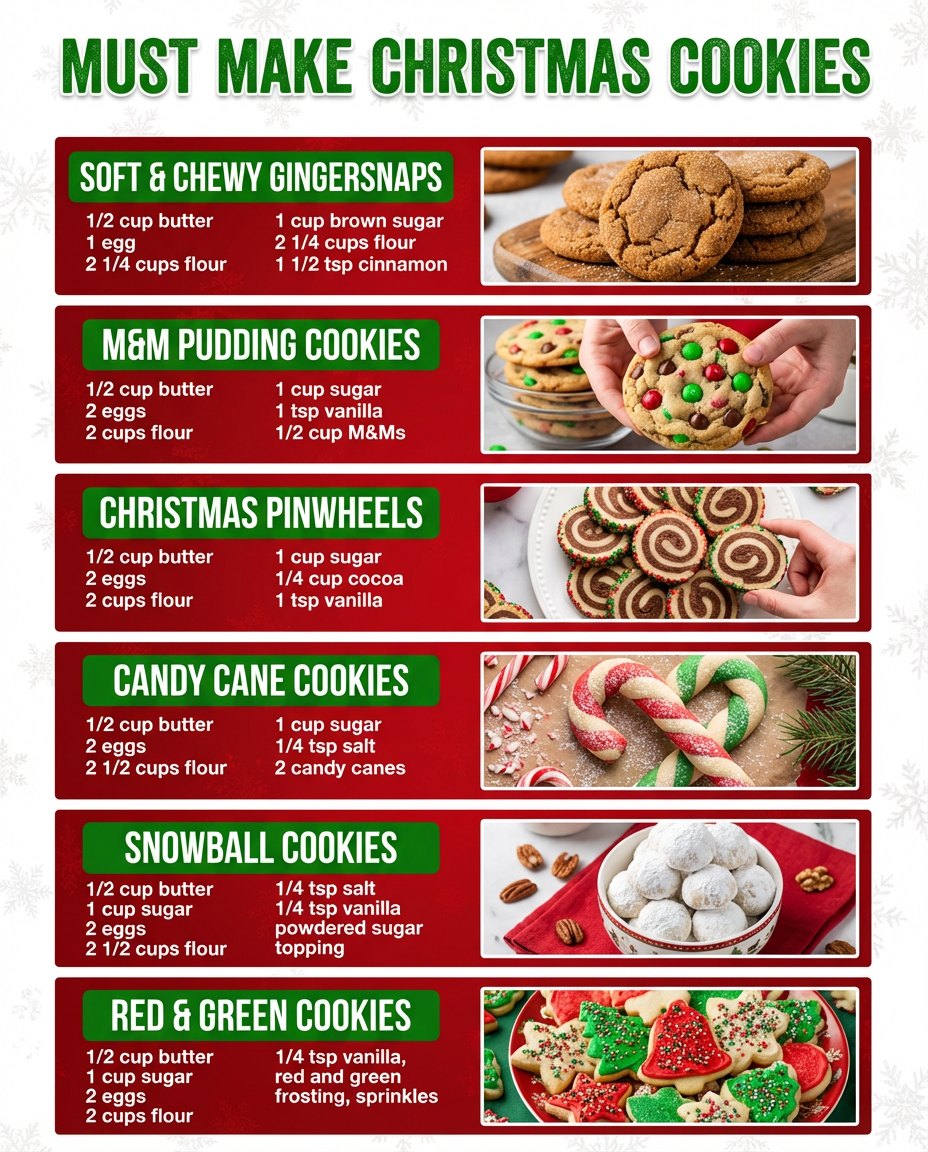 Keywords: Christmas cookies, holiday baking, gingersnaps, M&M cookies, pinwheel cookies, candy cane cookies, snowball cookies, sugar cookies, Christmas baking recipes, holiday cookie recipes, easy Christmas cookies, festive cookies