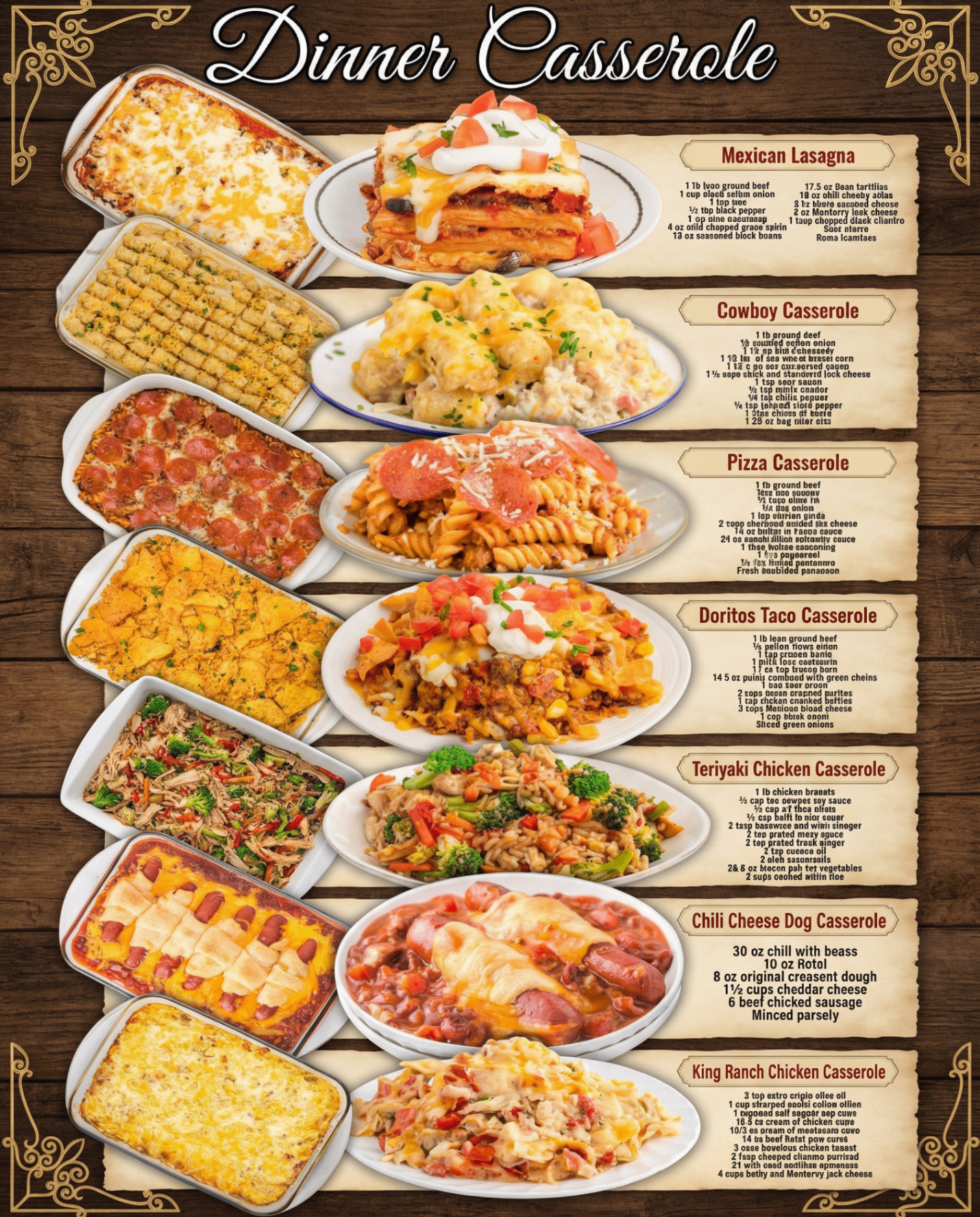 These seven dinner casseroles — from zesty Mexican Lasagna and crunchy Cowboy Casserole to fun Chili Cheese Dog Bake and comforting King Ranch Chicken — prove that one-pan meals can be exciting, flavorful, and effortless. Perfect for feeding a crowd, meal prepping, or busy weeknights, they bring big taste with minimal cleanup. Whether you crave Tex-Mex, pizza vibes, or classic comfort, there’s a casserole here to satisfy every craving. Grab your baking dish and start layering — your family will thank you! 🍲🧀