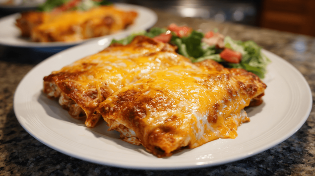 These wraps combine the best elements of multiple comfort foods: the wrapped, saucy satisfaction of enchiladas, the garlicky, cheesy goodness of garlic bread, and the protein-packed heartiness of a chicken burrito. It’s fusion cooking at its most delicious.