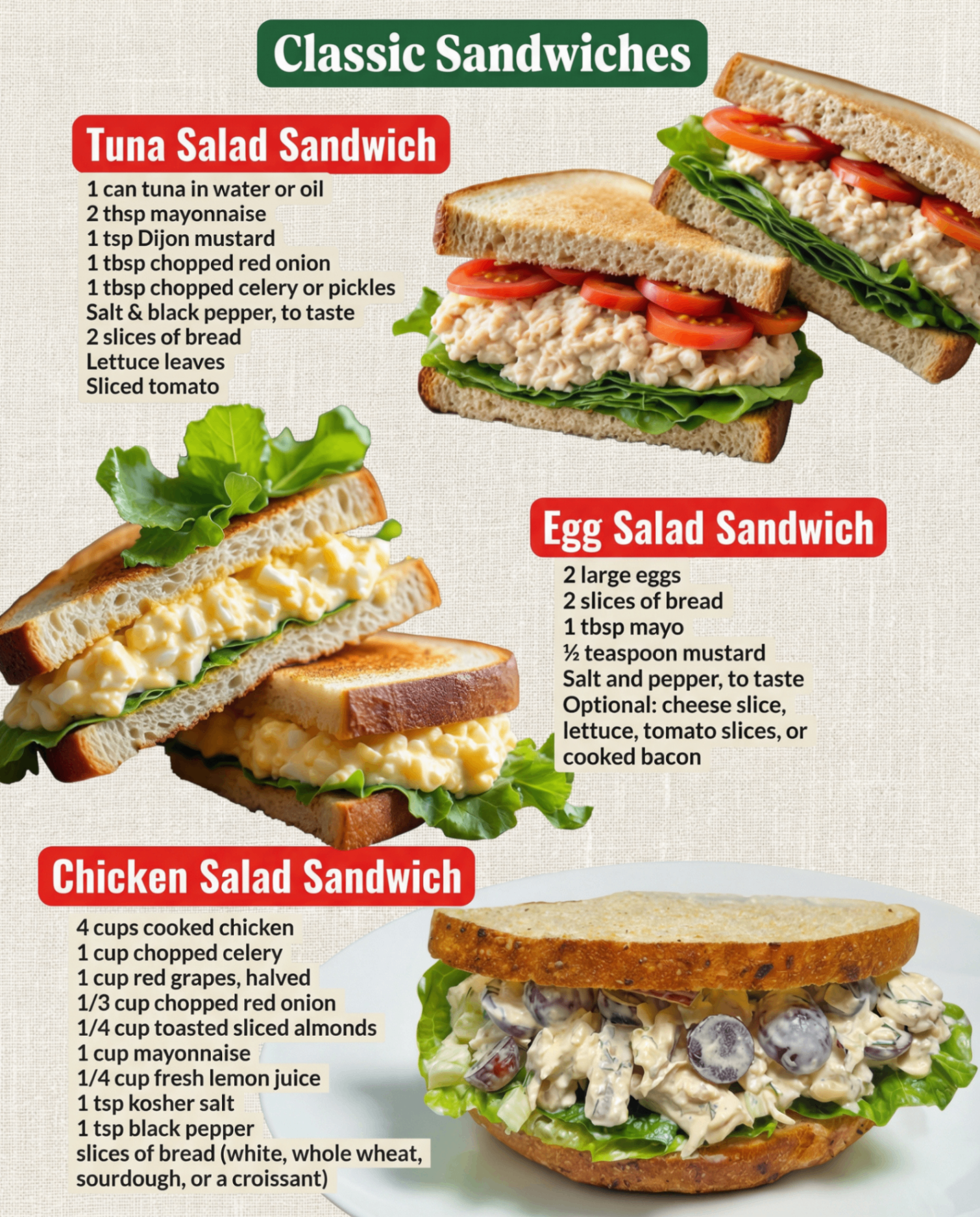 In this complete guide, you’ll discover three timeless sandwich recipes made with everyday ingredients and traditional methods. Each recipe includes exact ingredients, step-by-step instructions, serving tips, and storage advice, making this the ultimate resource for classic sandwich lovers.