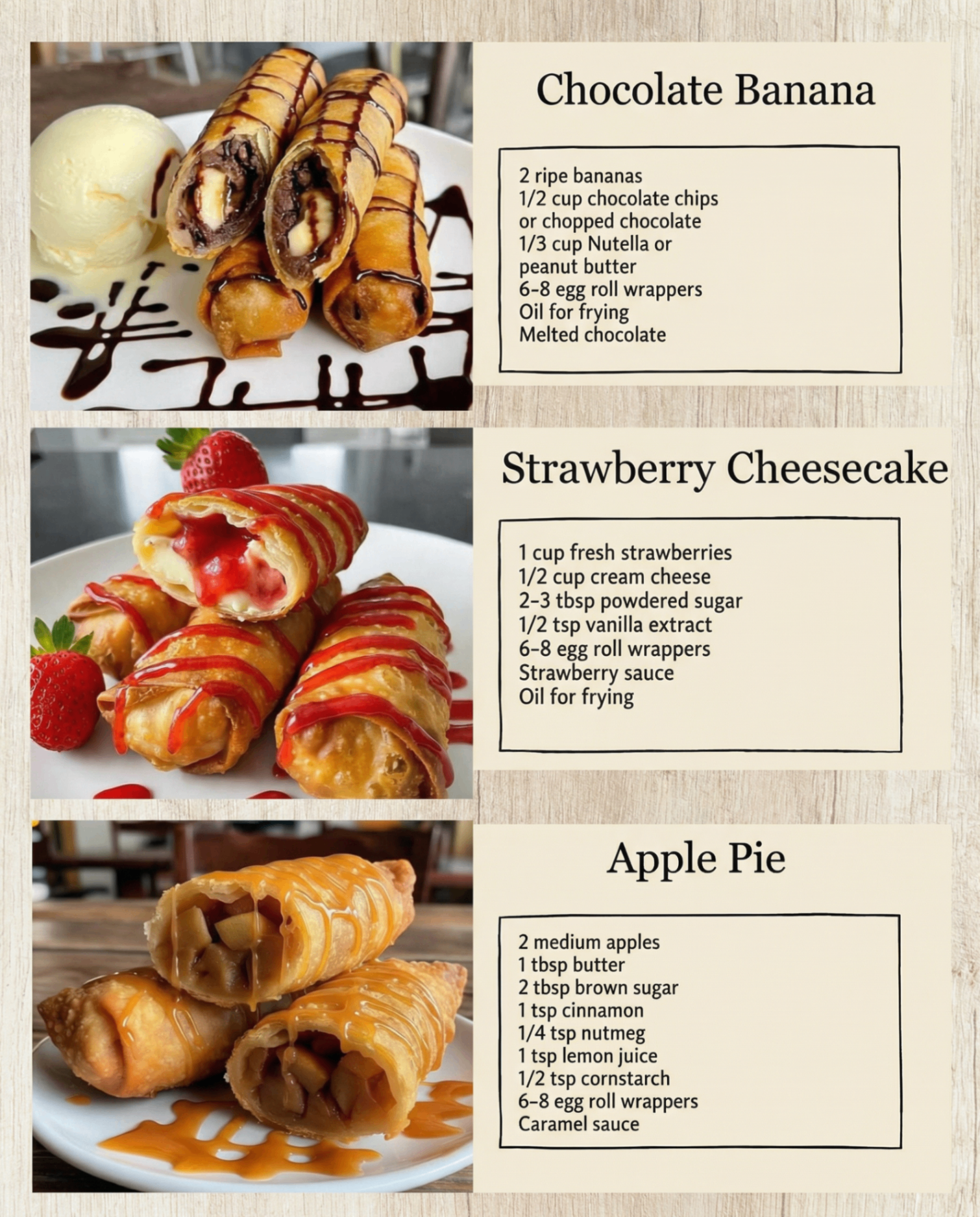 Crispy Dessert Egg Rolls: Chocolate Banana, Strawberry Cheesecake, and Apple Pie Recipes