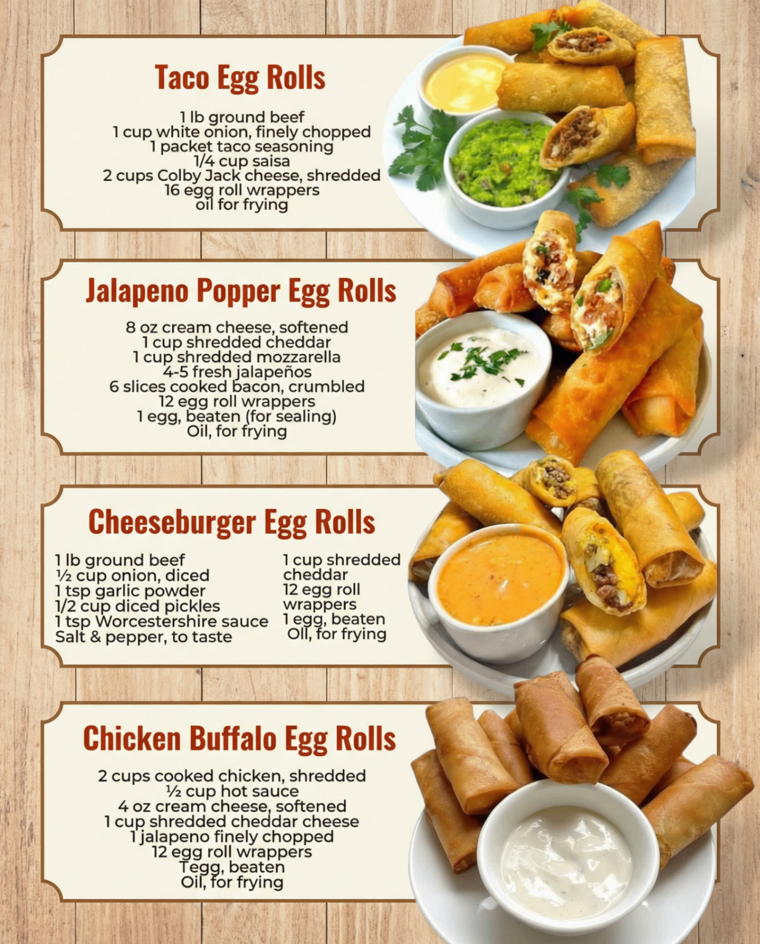 These four egg roll recipes—Taco, Jalapeno Popper, Cheeseburger, and Buffalo Chicken—transform simple ingredients into bold, crispy appetizers that steal the show. From zesty taco vibes to spicy buffalo heat, they’re perfect for game days, parties, or casual snacking. Easy to prep, fun to fry, and endlessly craveable, they’ll become your new go-to. Grab some wrappers and get rolling—your next gathering (or midnight snack) just got upgraded!