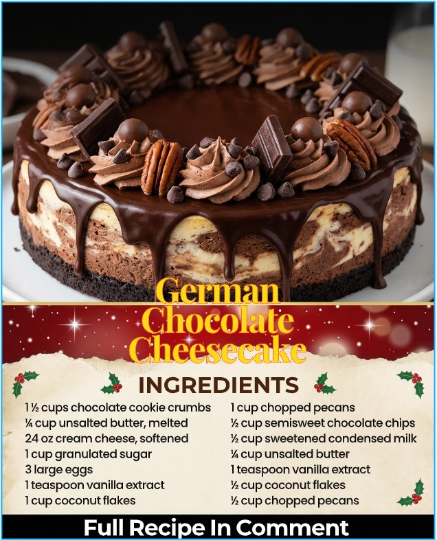 Meta Description: Indulge in this stunning German Chocolate Cheesecake with coconut pecan topping and chocolate swirls.