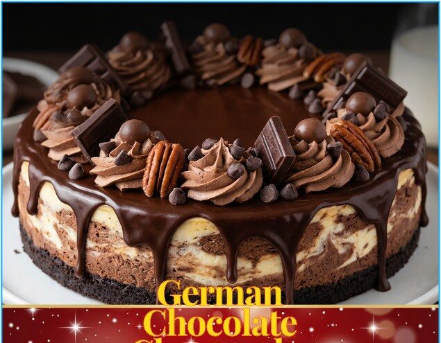 Meta Description: Indulge in this stunning German Chocolate Cheesecake with coconut pecan topping and chocolate swirls.