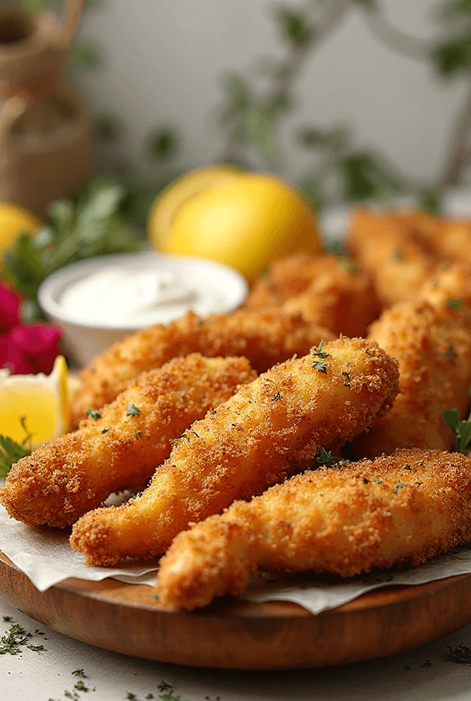 Arrange the golden tenders on a large platter lined with parchment paper or fresh lettuce leaves for a rustic Mediterranean look. Place lemon wedges strategically around the platter—they add color and functionality. Serve with small bowls of tzatziki sauce, hummus, and perhaps some tangy feta cheese sauce for dipping options. Garnish generously with fresh oregano, parsley, or dill for that authentic Greek appearance.