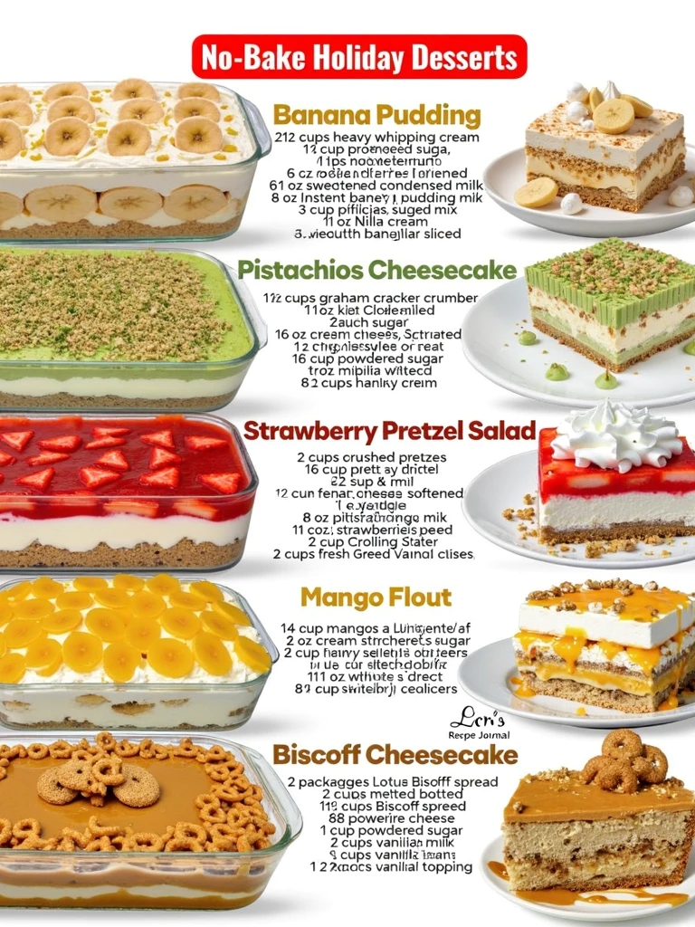 Each of these No-Bake Holiday Desserts holds special memories now. Banana Pudding reminds me of that Thanksgiving crisis. Pistachio Cheesecake was a hit at my sister’s wedding shower. Mango Float brings back memories of a Filipino friend who shared her family recipe. These aren’t just desserts—they’re stories, traditions, and connections.