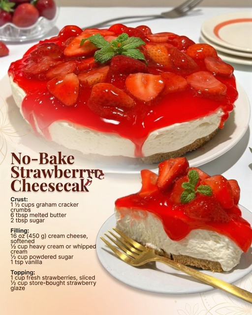 There’s something magical about biting into a slice of creamy, strawberry-topped cheesecake on a warm summer evening. I still remember the first time I made a no-bake strawberry cheesecake for my family’s Fourth of July gathering. My grandmother had always insisted that “real” cheesecakes required hours in the oven, but when she tasted this version, her eyes lit up with surprise and delight. “This is actually perfect,” she whispered, reaching for a second slice when she thought no one was looking.