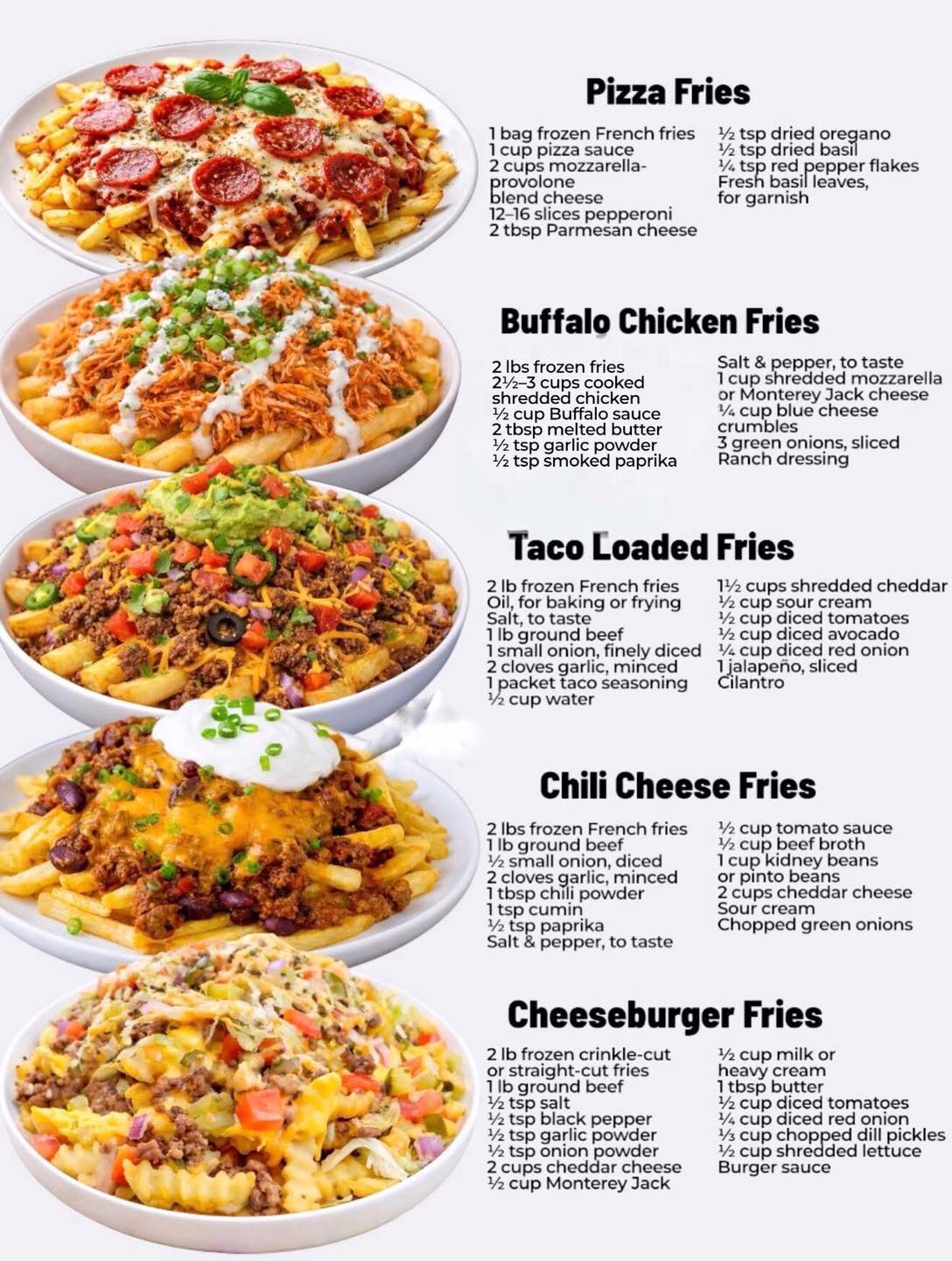 - White Pizza Fries: Use a garlic-cream base instead of red pizza sauce and top with ricotta and mozzarella.