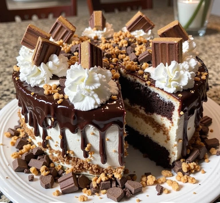 Picture this magnificent creation: two layers of rich chocolate cake sandwiching a generous layer of vanilla ice cream studded with chopped Reese’s cups. The whole thing is then blanketed in pillowy whipped cream, drizzled with chocolate sauce, and absolutely loaded with more peanut butter cups and toffee bits. It’s a dessert that demands attention and delivers on every promise.
