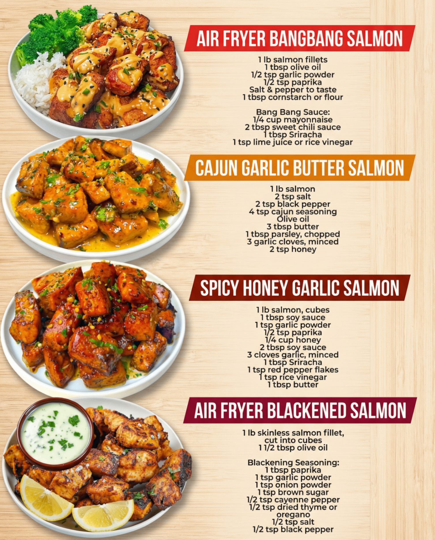 These four air fryer salmon bite recipes—Bang Bang, Cajun Garlic Butter, Spicy Honey Garlic, and Blackened—prove you can create restaurant-worthy meals in minutes with minimal effort. From creamy-spicy to sweet-sticky and boldly seasoned, there’s a flavor for every craving. Quick to prep, healthy, and packed with taste, they’re ideal for busy weeknights, meal prep, or impressing guests. Fire up your air fryer and enjoy the crispy, saucy goodness—your new favorite salmon dinner awaits!