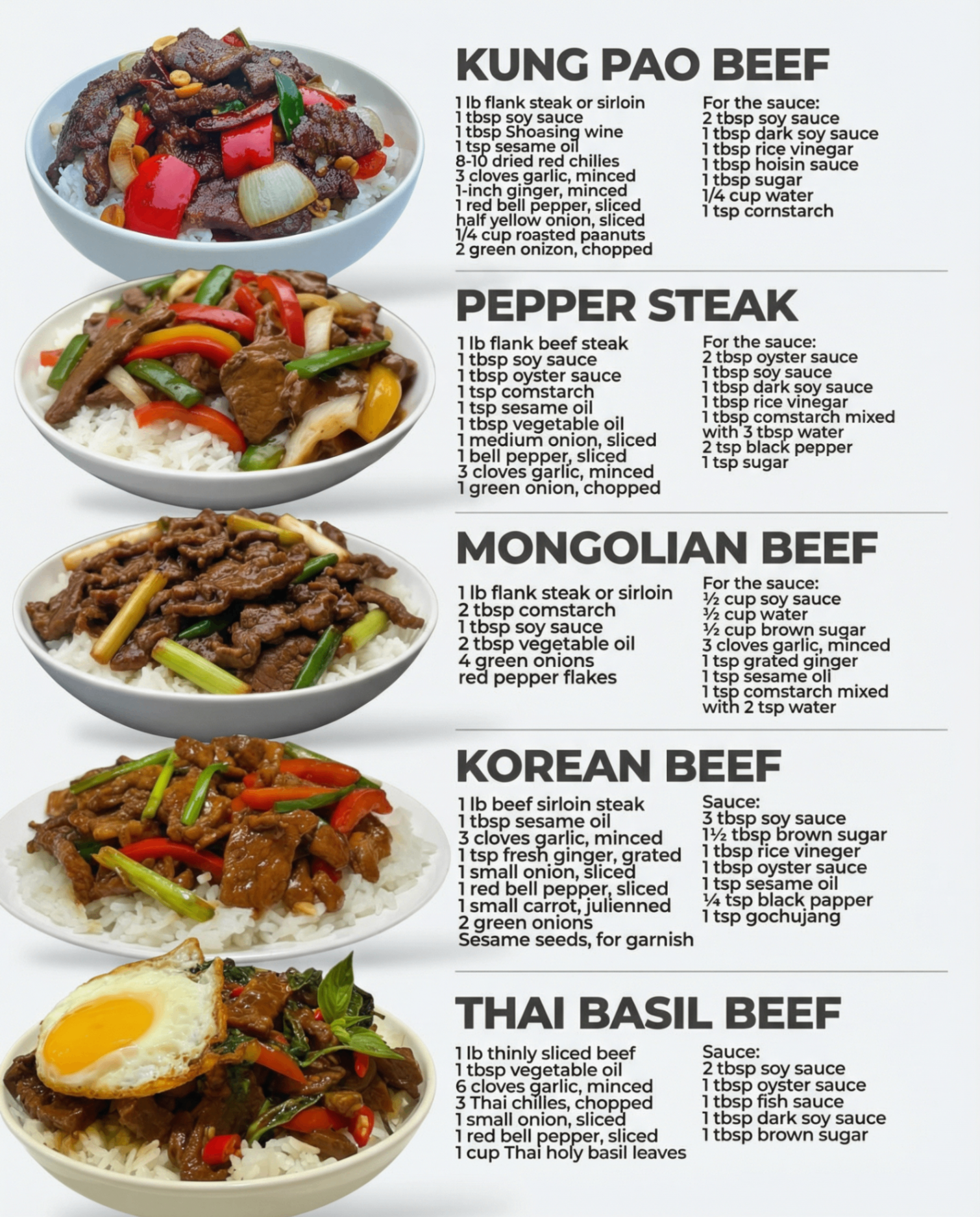 These five Asian beef recipes—Kung Pao Beef, Pepper Steak, Mongolian Beef, Korean Beef, and Thai Basil Beef—bring authentic flavors straight to your kitchen. Each dish showcases a unique regional style while remaining simple, fast, and deeply satisfying.