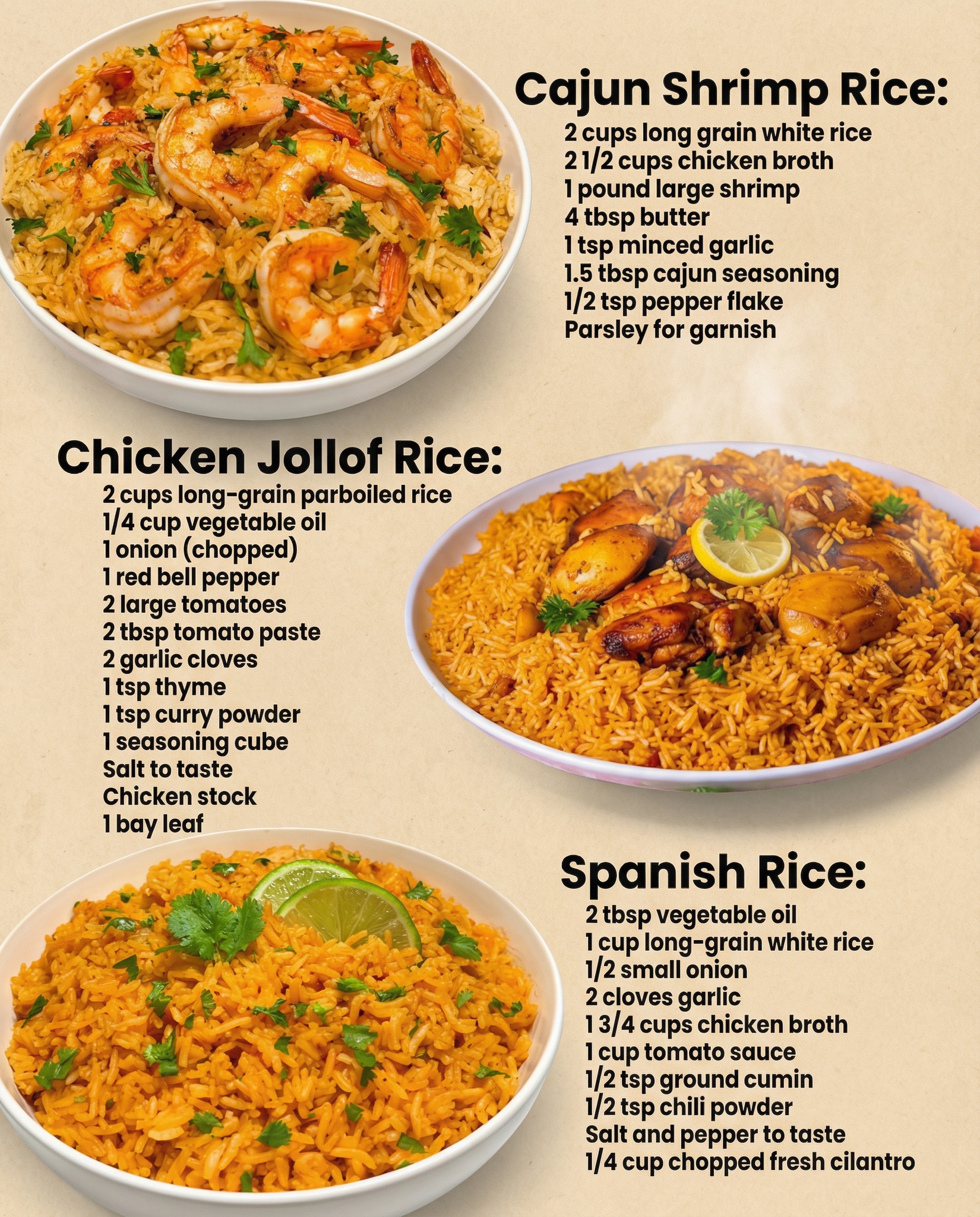 From spicy Cajun flavors to tomato-rich Jollof rice and savory Spanish rice, each dish in this guide highlights how rice can take on completely different personalities depending on seasoning and technique.