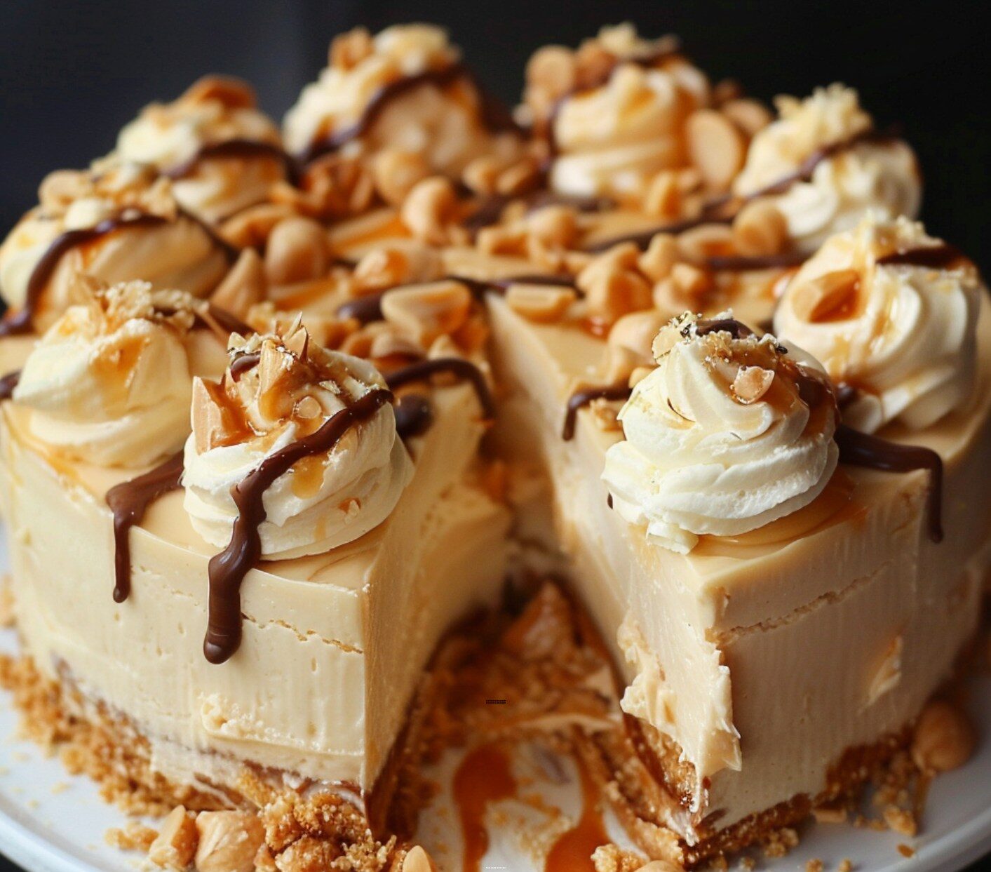 Looking at this decadent creation, it’s a showstopper with its golden crust peeking out from under a thick, creamy layer topped with swirls of whipped topping, drizzled caramel and chocolate sauces, and scattered peanuts for that perfect crunch. The slice reveals a smooth, pale filling that’s irresistible—imagine biting into that first forkful where the flavors meld perfectly.