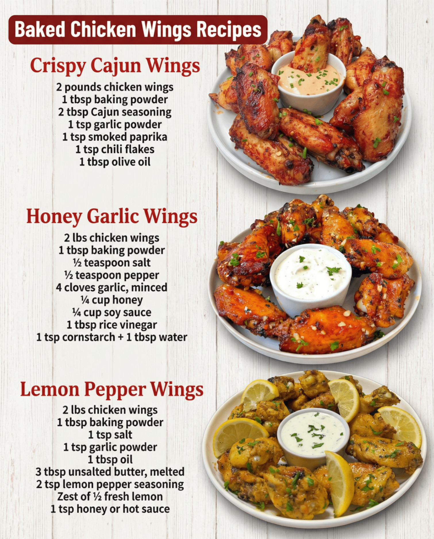 These three baked chicken wings recipes—Crispy Cajun, Honey Garlic, and Lemon Pepper—prove you don’t need a deep fryer for restaurant-quality results. With simple ingredients, high-heat baking, and the magic of baking powder, you’ll get tender, juicy meat under shatteringly crispy skin every time. Perfect for any occasion, they’re customizable, healthier, and always a hit.
